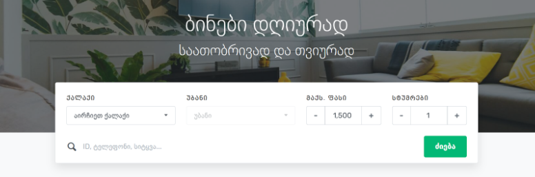 - შედით პლატფორმაზე და შეავსეთ ძიების ფილტრები (მდებარეობა, ფასი, თარიღები, ოთახების რაოდენობა)