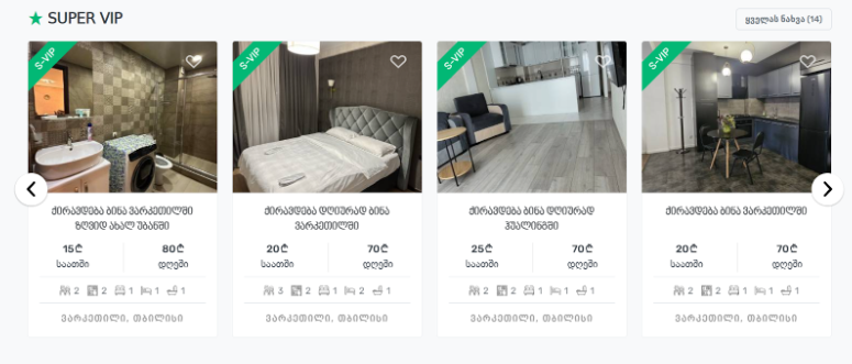 - გამარტივებული ძიება – პლატფორმაზე ინტეგრირებული ფილტრების სისტემა საშუალებას აძლევს მომხმარებელს, სწრაფად იპოვოს სასურველი პარამეტრების მქონე ბინა. შესაძლებელია ძიება ფასის, მდებარეობის, ოთახების რაოდენობის, დამატებითი მახასიათებლების (ინტერნეტი, კონდიციონერი, პარკინგი და ა.შ.) მიხედვით.