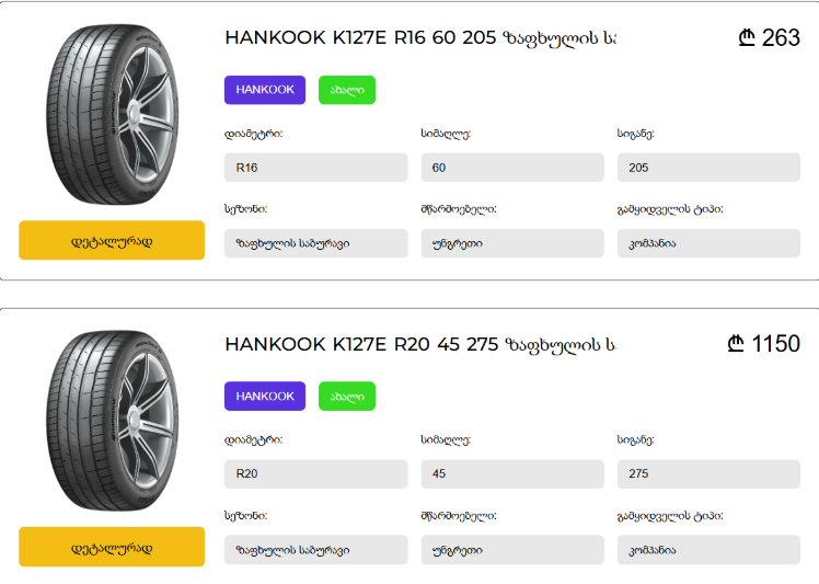 - მრავალფეროვანი კატეგორიები – პლატფორმაზე წარმოდგენილია ზამთრის საბურავები, ზაფხულის საბურავები და ყველა სეზონის მოდელები