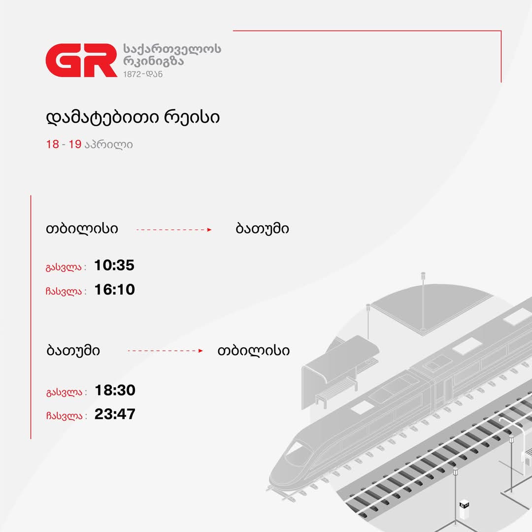 “აღდგომის დღესასწაულთან დაკავშირებით, “საქართველოს რკინიგზა” 18 და 19 აპრილს, თბილისი-ბათუმი-თბილისის მიმართულებით რეისებს ამატებს.