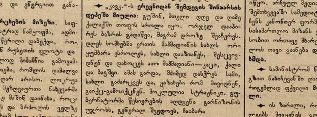 „„კავკ.“-ს ერევნიდან შემდეგის შინაარსის დეპეშა მიუღია: გუშინ, მთელი დღე და ღამე ქალაქში თოფის სროლა იყო. ორჯელ დააპირეს ბაზრის გადაწვა, მაგრამ დროზე შეაჩერეს. დღეს სომხებმა ერთის მაჰმადიანის სახლს ორი ყუმბარა ესროლეს, სახლი დააზიანეს, შესცვივდნენ და დახოცეს ათი მაჰმადიანი – კაცი, ქალი და ბავშვი. ამას გარდა, მძიმედ დაჭრეს სამი, სახლი გაძარცვეს და, ყაზახები რომ მივიდნენ, გაიქც-გამოიქცნენ. მოკლულია სტრაჟნიკი. გუბერნატორმა წესიერების აღდგენა გარნიზონის უფროსს, გენერალ შვედოვს ჩააბარა.“