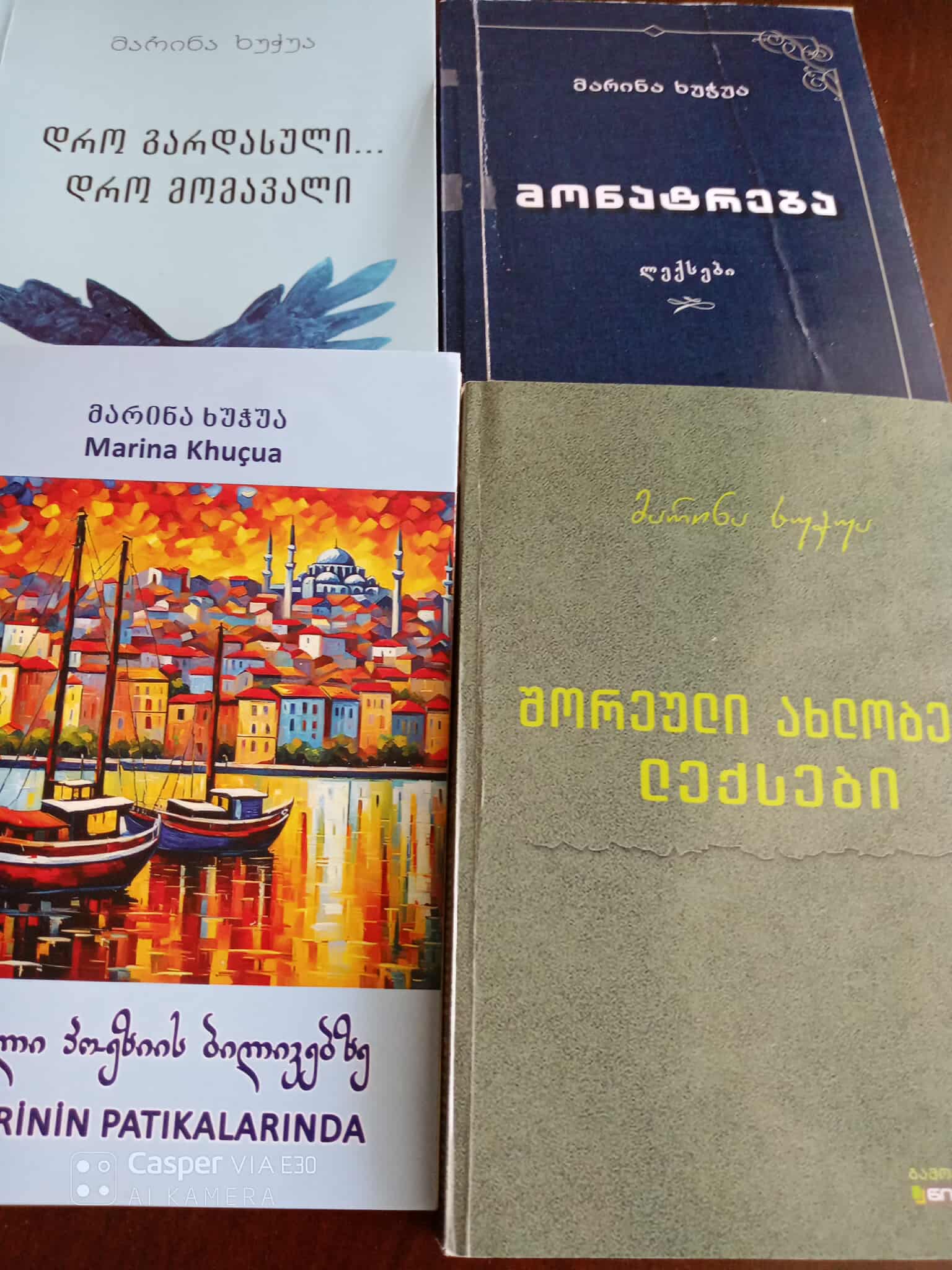 წერს ლექსებს, თარგმნის თურქულიდან. განსაკუთრებით უყვარს თარგმნის პროცესი. 4 პოეტური კრებულის ავტორია. უყვარს ქსოვაც. – მარინა ხუჭუას პერსონა.