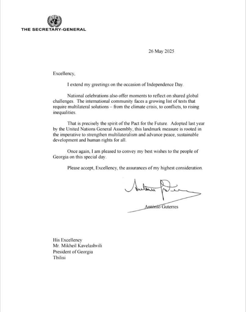 გაერთიანებული ერების ორგანიზაციის გენერალური მდივანი ანტონიო გუტერეში საქართველოს პრეზიდენტ მიხეილ ყაველაშვილს დამოუკიდებლობის დღეს ულოცავს.