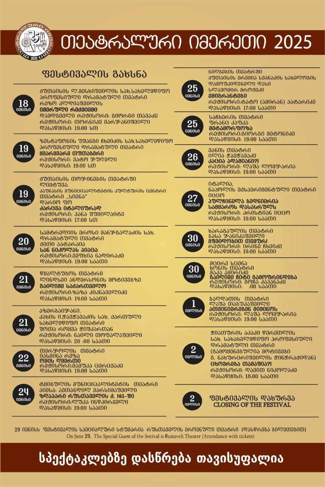 საკონკურსო სპექტაკლებს ჟიური შეაფასებს. ფესტივალი 2 ივლისს დაიხურება“, – ნათქვამია ინფორმაციაში.