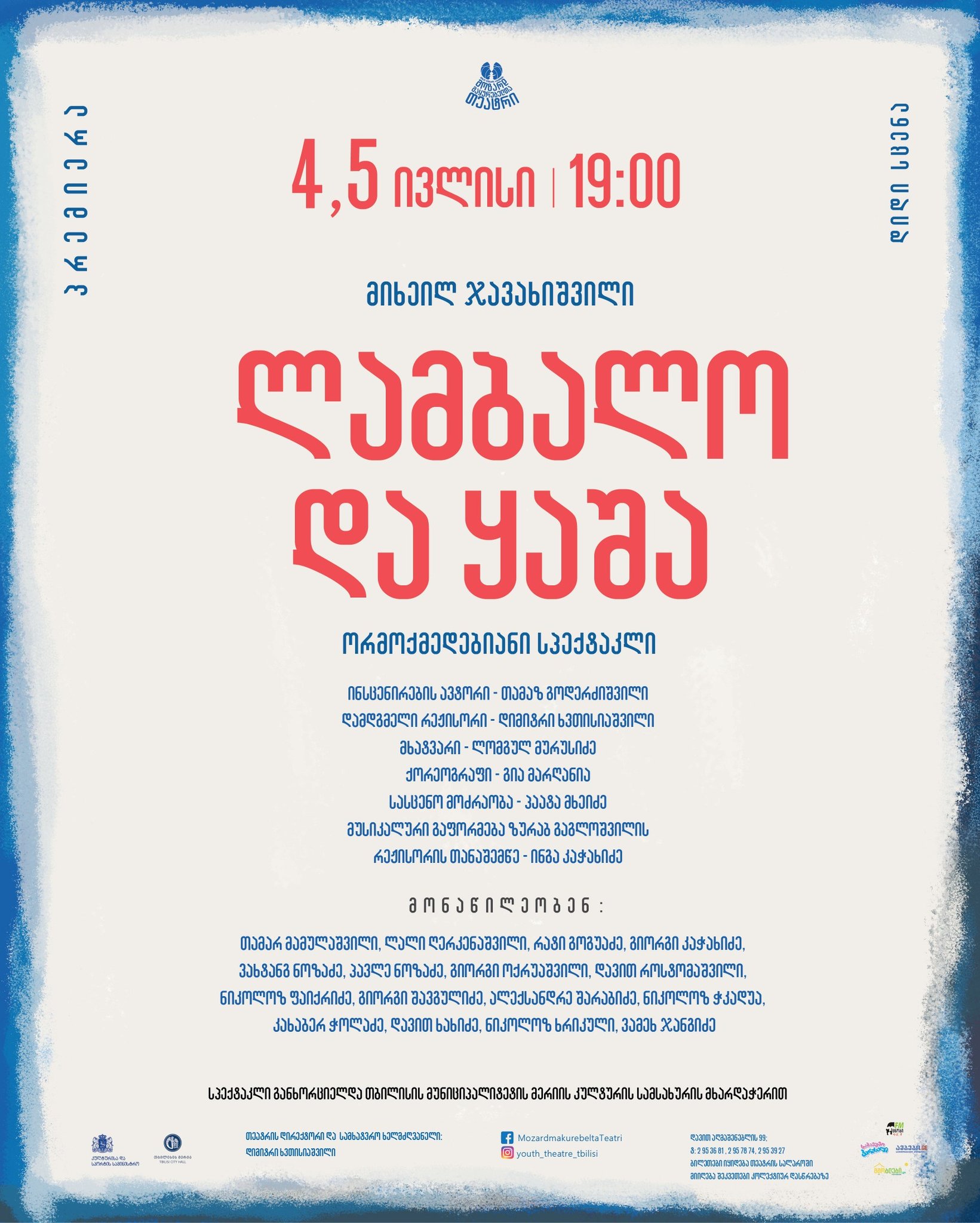 4, 5 ივლისს, 19:00 საათზე, ნოდარ დუმბაძის სახელობის მოზარდ მაყურებელთა თეატრში პრემიერაა: