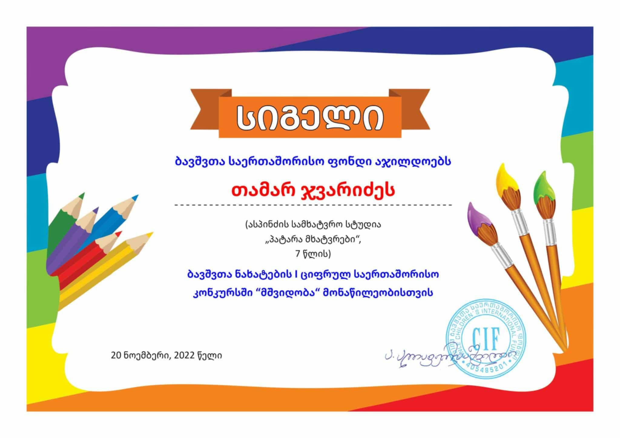 2025 წელს, საქართველოს რეგიონების სახელოვნებო სასწავლებლების კონკურსში კი მოიპოვა პირველი ხარისხის დიპლომი. – თამარ ჯვარიძის პერსომა.