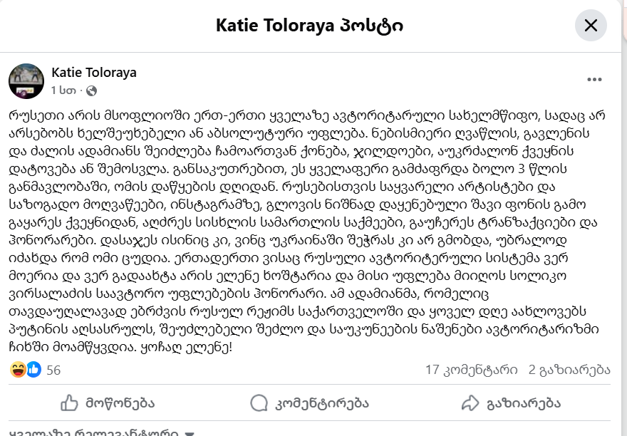 “რუსეთი არის მსოფლიოში ერთ-ერთი ყველაზე ავტორიტარული სახელმწიფო, სადაც არ არსებობს ხელშეუხებელი ან აბსოლუტური უფლება. ნებისმიერი ღვაწლის, გავლენის და ძალის ადამიანს შეიძლება ჩამოართვან ქონება, ჯილდოები, აუკრძალონ ქვეყნის დატოვება ან შემოსვლა. განსაკუთრებით, ეს ყველაფერი გამძაფრდა ბოლო 3 წლის განმავლობაში, ომის დაწყების დღიდან. რუსებისთვის საყვარელი არტისტები და საზოგადო მოღვაწეები, ინსტაგრამზე, გლოვის ნიშნად დაყენებული შავი ფონის გამო გაყარეს ქვეყნიდან, აღძრეს სისხლის სამართლის საქმეები, გაუჩერეს ტრანზაქციები და ჰონორარები. დასაჯეს ისინიც კი, ვინც უკრაინაში შეჭრას კი არ გმობდა, უბრალოდ იძახდა რომ ომი ცუდია. ერთადერთი ვისაც რუსული ავტორიტეტული სისტემა ვერ მოერია და ვერ გადაახტა არის ელენე ხოშტარია და მისი უფლება მიიღოს სოლიკო ვირსალაძის საავტორო უფლებების ჰონორარი. ამ ადამიანმა, რომელიც დაუღალავად ებრძვის რუსულ რეჟიმს საქართველოში და ყოველ დღე აახლოებს პუტინის აღსასრულს, შეუძლებელი შეძლო და საუკუნეების ნაშენები ავტორიტარიზმი ჩიხში მოამწყვდია. ყოჩაღ ელენე!” – წერს თოლორაია.