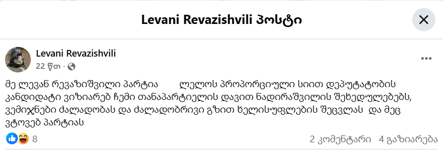 ,,მე ლევან რევაზიშვილი პარტია ლელოს პროპორციული სიით დეპუტატობის კანდიდატი ვიზიარებ ჩემი თანაპარტიელის დავით ნადირაშვილის შეხედულებებს, ვემიჯნები ძალადობას და ძალადობრივი გზით ხელისუფლების შეცვლას და მეც ვტოვებ პარტიას”,- წერს რევაზიშვილი.