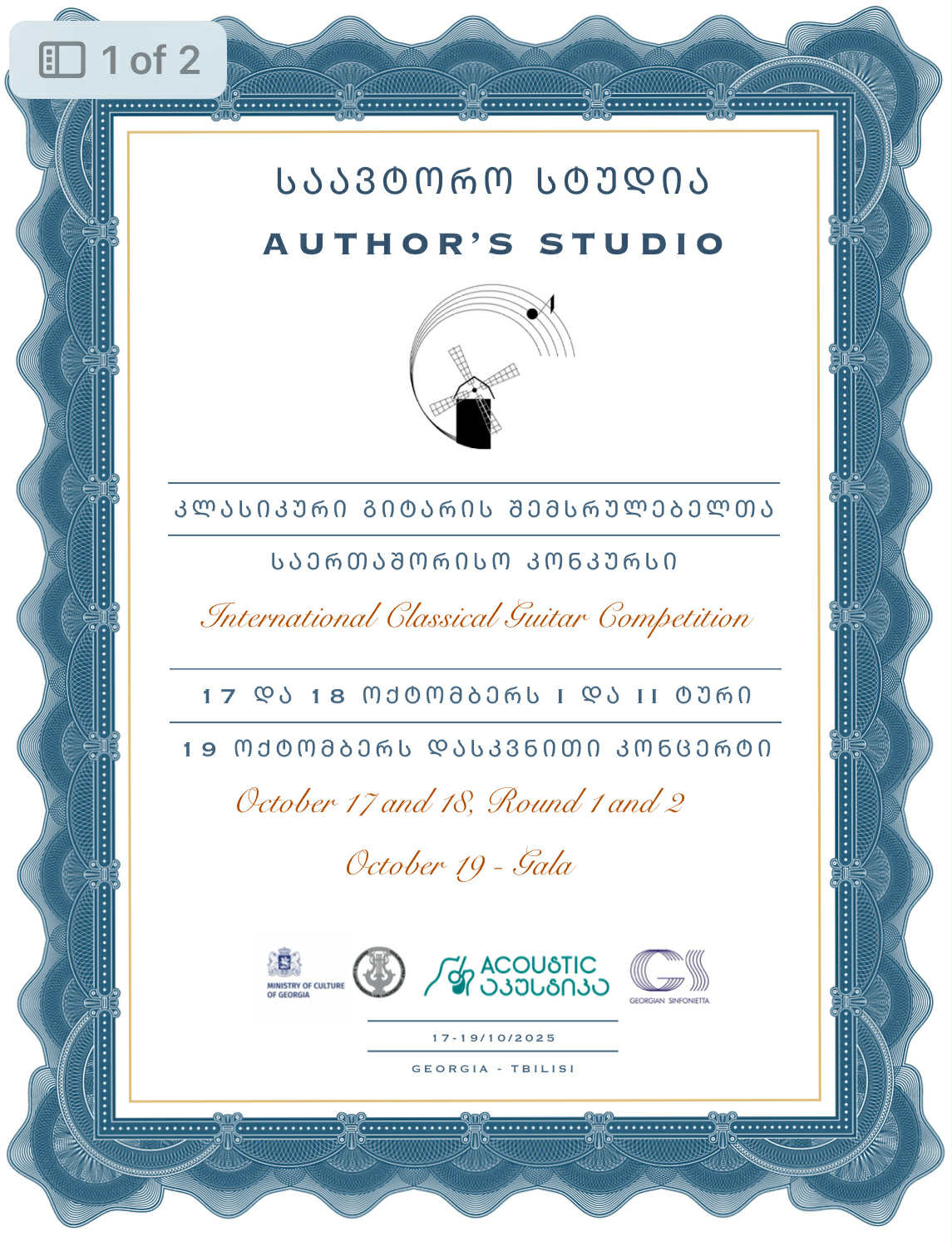 „მოგესალმებით, გაცნობებთ, რომ 17, 18 (ტურები) და 19 ოქტომბერს (გალა) თბილისის სახელმწიფო კონსერვატორიის (გრიბოედოვის ქ.) კამერულ დარბაზში, (III სართულზე გაიმართება „კლასიკური გიტარის შემსრულებელთა საერთაშორისო კონკურსი“, რომელიც წელს უკვე მეცხრედ ჩატარდება. ჩამოდიან უცხოელი შემსრულებლებიც. კონკურსში მონაწილეობას მიიღებენ სხვადასხვა ასაკობრივი ჯგუფის წარმომადგენლები.