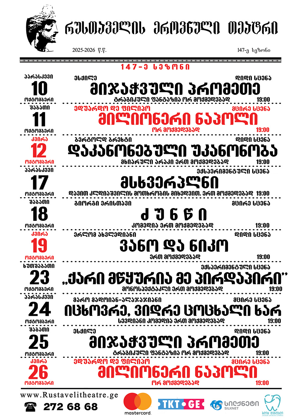 10 ოქტომბერს, 19:00 საათზე, რუსთაველის ეროვნული თეატრის 147-ე სეზონი იხსნება.