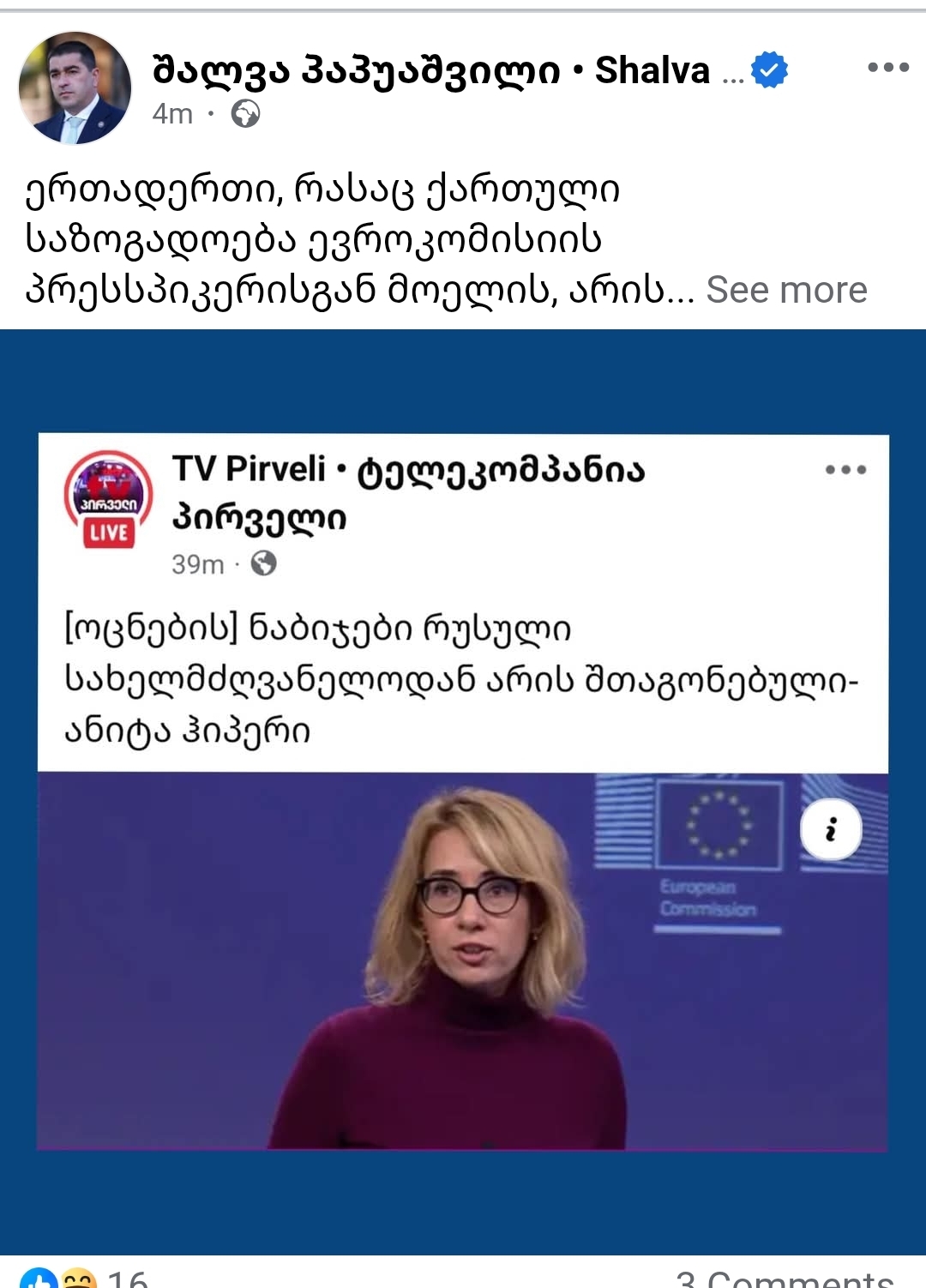 “ერთადერთი, რასაც ქართული საზოგადოება ევროკომისიის პრესსპიკერისგან მოელის, არის ბოდიში ხელისუფლების დამხობის მიზნით დაორგანიზებული შეკრების მხარდაჭერის გამო, რომლის მონაწილენიც პრეზიდენტის სასახლეში შეიჭრნენ და 25 პოლიციელი დააზიანეს”, – ამის შესახებ პარლამენტის თავმჯდომარე, შალვა პაპუაშვილი სოციალურ ქსელში წერს.