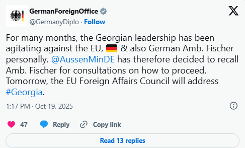 “მრავალი თვის განმავლობაში, საქართველოს ხელმძღვანელობა აწარმოებდა კამპანიას ევროკავშირისა და პირადად გერმანიის ელჩის, ბატონი ფიშერის წინააღმდეგ. ამიტომ, გერმანიის საგარეო საქმეთა სამინისტრომ გადაწყვიტა, ელჩი ფიშერი გამოიწვიოს კონსულტაციებისთვის შემდგომი ნაბიჯების განსახილველად. ხვალ ევროკავშირის საგარეო საქმეთა საბჭო განიხილავს საქართველოს საკითხს”, – წერია ინფორმაციაში.