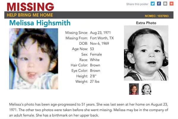 მელანი, რომელიც ამ სახელით ცხოვრობდა, ტეხასში, ფორტ-უერტის მახლობლად იზრდებოდა – გატაცების ადგილიდან სულ რაღაც 10 წუთის სავალზე. მელისას ძმები, რომლებიც მას არასოდეს შეხვედროდნენ, მაშინვე დაუკავშირდნენ მელანის Facebook-ის საშუალებით. მას ჯერ ეგონა, რომ ეს თაღლითობა იყო, მაგრამ როდესაც ოჯახმა ბავშვობის ფოტოები და მელისა ჰაისმითის უნიკალურ ნიშნებზე ინფორმაცია გაუგზავნეს, ქალს ეჭვი გაუჩნდა. მელანიმ, რომელსაც მუდამ ჰქონდა ეჭვი თავისი უჩვეულო და რთული ბავშვობის გამო, ეს ამბავი დაუყოვნებლივ მოუყვა ქალს, ვინც მას ზრდიდა. ქალმა აღიარა, რომ მან მელანი 1972 წელს 500 დოლარად იყიდა.