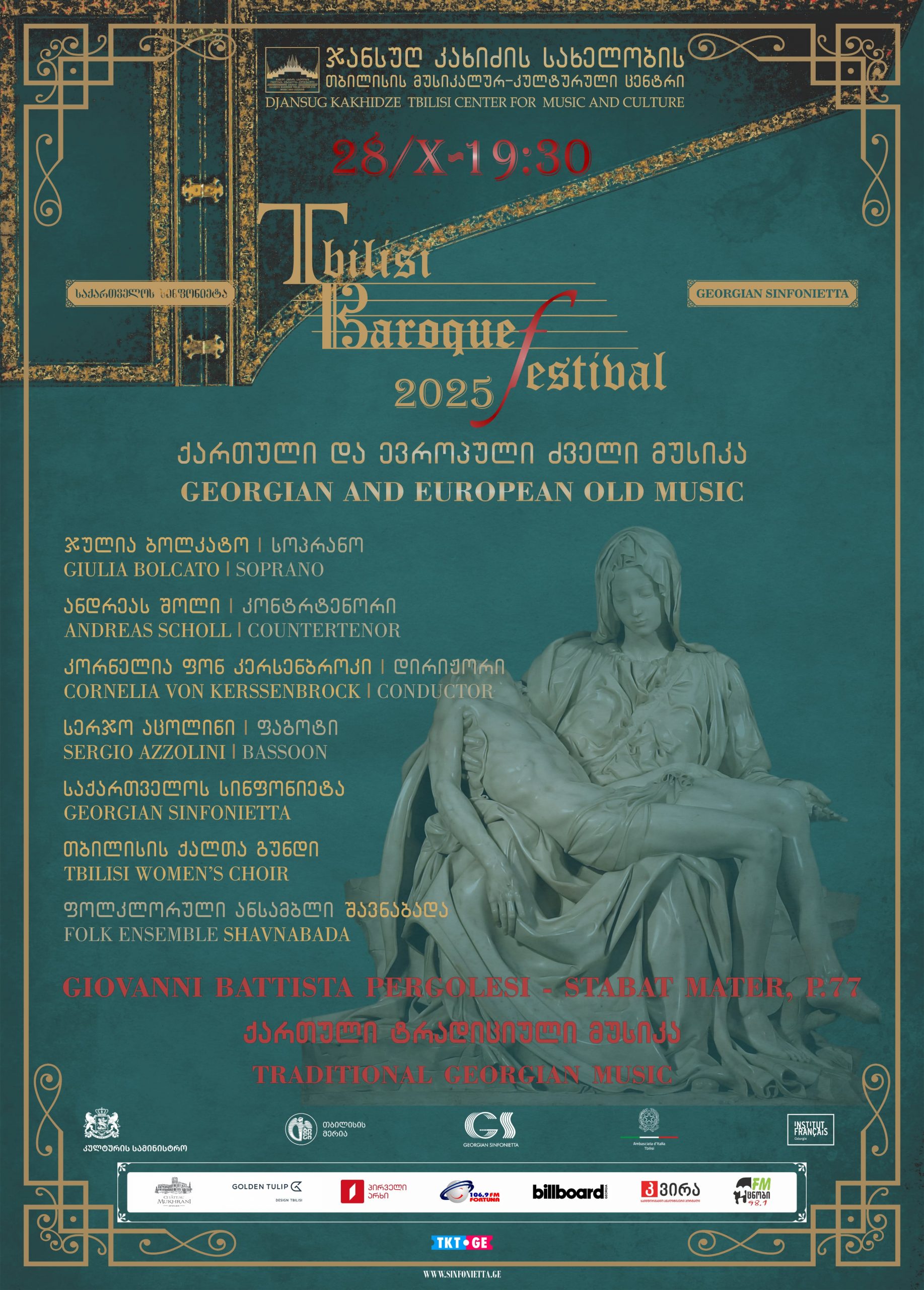 2025 წლის ფესტივალის გეოგრაფიული არეალი გაიზარდა და თბილისის სხვადასხვა საკონცერტო დარბაზსა თუ თეატრს მოიცავს. „თბილისის ბაროკო ფესტივალი“ 28 ოქტომბერს, ჯანსუღ კახიძის სახელობის თბილისის მუსიკალურ-კულტურულ ცენტრში გაიხსნება კონცერტით – „ქართული და ევროპული ძველი მუსიკა“, სადაც პირველ განყოფილებაში ფოლკლორული ანსამბლი „შავნაბადა“ ქართული ტრადიციული მუსიკის უძველეს ნიმუშებს წარმოადგენს, ხოლო მეორე განყოფილებაში, მსოფლიოში აღიარებული კონტრტენორი ანდრეას შოლი, ცნობილი იტალიელი სოპრანო ჯულია ბოლკატო, „თბილისის ქალთა გუნდი“ და „საქართველოს სინფონიეტა“, კორნელია ფონ კერსენბროკის დირიჟორობით, ჯოვანი ბატისტა პერგოლეზის შედევრს – Stabat Mater-ს შეასრულებენ.