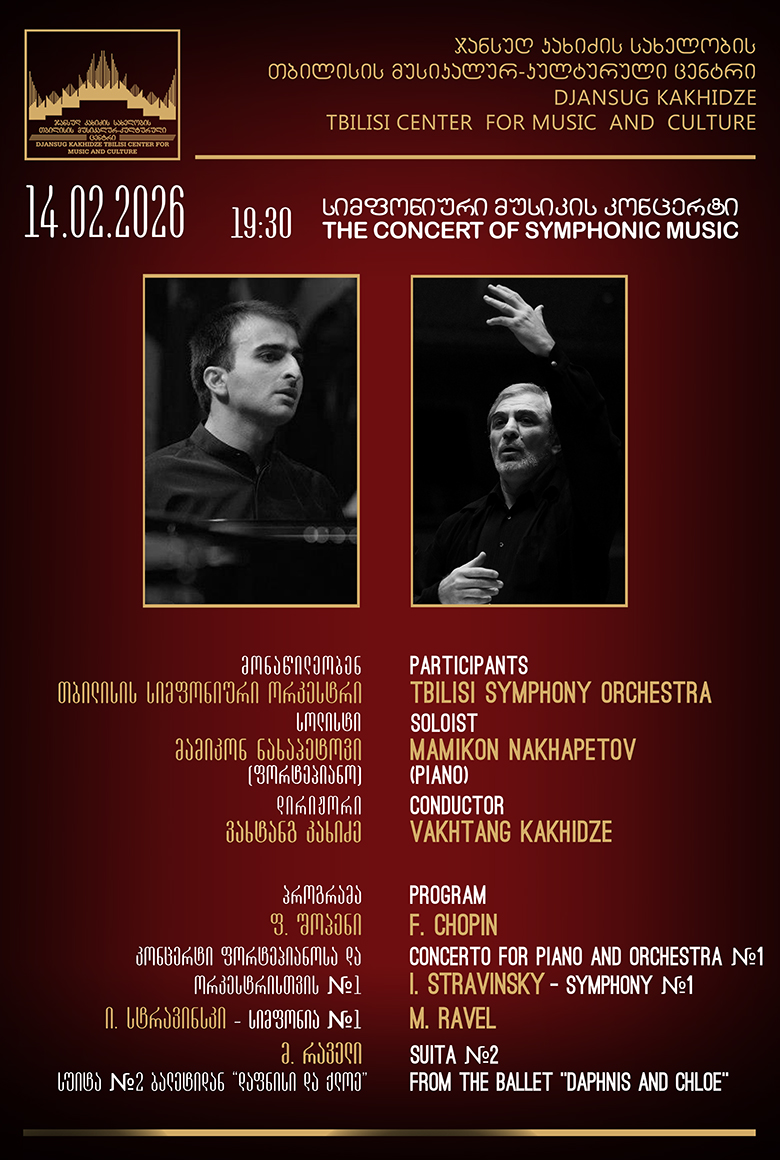 14 თებერვალს, 19:30 საათზე, ჯანსუღ კახიძის სახელობის თბილისის მუსიკალურ-კულტურულ ცენტრში, სიმფონიური მუსიკის კონცერტი გაიმართება.