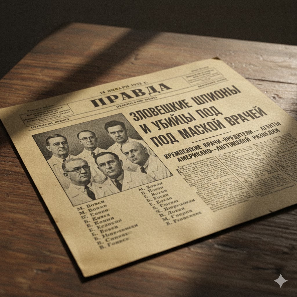 1953 წლის 13 იანვარს საბჭოთა კავშირი შოკისმომგვრელმა ამბავმა შეძრა: გაზეთმა „პრავდამ“ გამოაქვეყნა სტატია — „ბოროტი ჯაშუშები და მკვლელები ექიმების ნიღაბქვეშ“. კრემლის ელიტური ექიმების ჯგუფს ბრალად ედებოდათ მაღალი რანგის ლიდერების (მათ შორის, ანდრეი ჟდანოვის) განზრახ არასწორი მკურნალობა და მათი დახოცვა უცხოური დაზვერვის დავალებით.