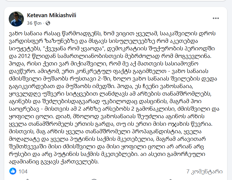 “ვახო სანაია რასაც წარმოადგენს, ხომ ვიცით ყველამ, სააკაშვილის დროს ვარდისფერ ზაზუნებზე და მსგავს სისულელეებზე რომ აკეთებდა სიუჟეტებს, “ქვეყანა რომ ყვაოდა”, დემოკრატიის შუქურობის პერიოდში და 2012 წლიდან სამართლიანობისთვის მებრძოლად რომ მოგვევლინა. ჰოდა, რისი ქეთი ვარ მიქიაშვილი, რომ მე აქ მათთვის სასიამოვნო დავწერო. ამიტომ, ერთ კონკრეტულ ფაქტს გაგიმხელთ – ვახო სანაიას ძმისშვილი მუშაობს რუსთავი 2-ში, ხოლო ვახო სანაიას შვილების დედა გაგიკვირდებათ და მუშაობს იმედში. ჰოდა, ეს ჩვენი ვახო სანაია, ყოველდღე უშვერი სიტყვებით ლანძღავს ამ არხების თანამშრომლებს, აგინებს და შეძლებისდაგვარად უკბილოდაც დასცინის, მაგრამ ჰოი საოცრებავ – მისთვის ამ 2 არხზე არსებობს 2 გამონაკლისი, ძმისშვილი და ყოფილი ცოლი. დიახ, მხოლოდ ვახო სანაიას შეუძლია აგინოს არხის ყველა თანამშრომელს ერთის გარდა, თუ ის ერთი მისი ოჯახის წევრია. მისთვის, მაგ არხის ყველა თანამშრომელი პროპაგანდისტია, ყველა მოღალატე და ყველა პუტინის საქმის მკეთებელია, მაგრამ არავითარ შემთხვევაში მისი ძმისშვილი და მისი ყოფილი ცოლი არ არიან არც რუსები და არც პუტინის საქმის მკეთებლები. აი ასეთი გამორჩეული ადამიანიც გვყავს ქართველებს.”- წერს მიქიაშვილი.