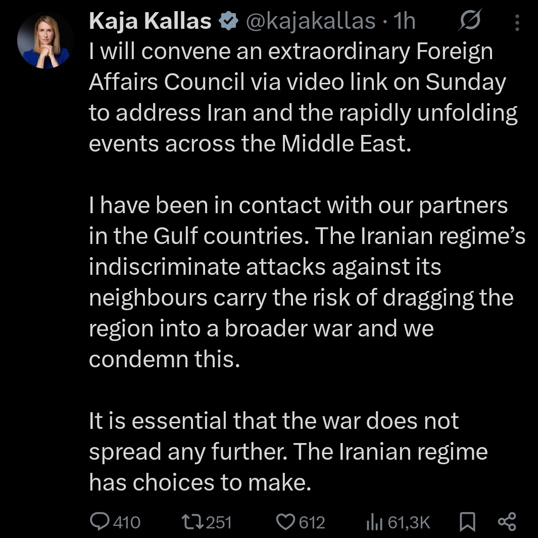 „სპარსეთის ყურის ქვეყნებში ჩვენს პარტნიორებთან კონტაქტში ვარ. ირანის რეჟიმი მეზობლების წინააღმდეგ თავდასხმებს ახორციელებს, რაც რეგიონის ფართომასშტაბიან ომში ჩათრევის რისკს შეიცავს. ჩვენ ამას ვგმობთ“, – წერს კალასი და აღნიშნავს, რომ კვირას ირანში განვითარებულ მოვლენებთან დაკავშირებით ევროკავშირის საგარეო საქმეთა საბჭოს საგანგებო სხდომა გაიმართება.