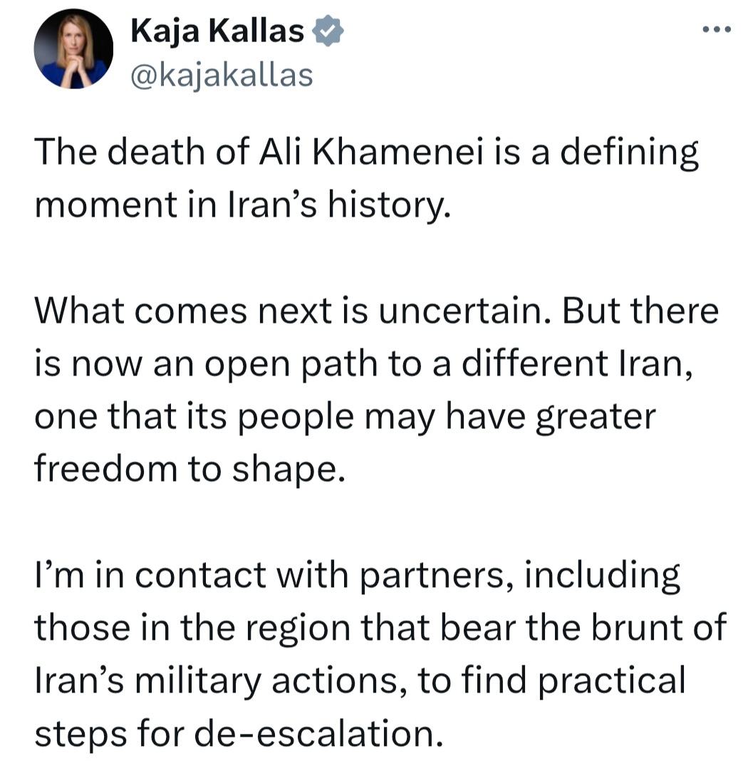 „ალი ხამენეის გარდაცვალება ირანის ისტორიაში გარდამტეხი მომენტია. რა მოხდება შემდგომ, ჯერჯერობით გაურკვეველია; თუმცა, ახლა გაიხსნა გზა სხვა ირანისკენ” – კაია კალასი