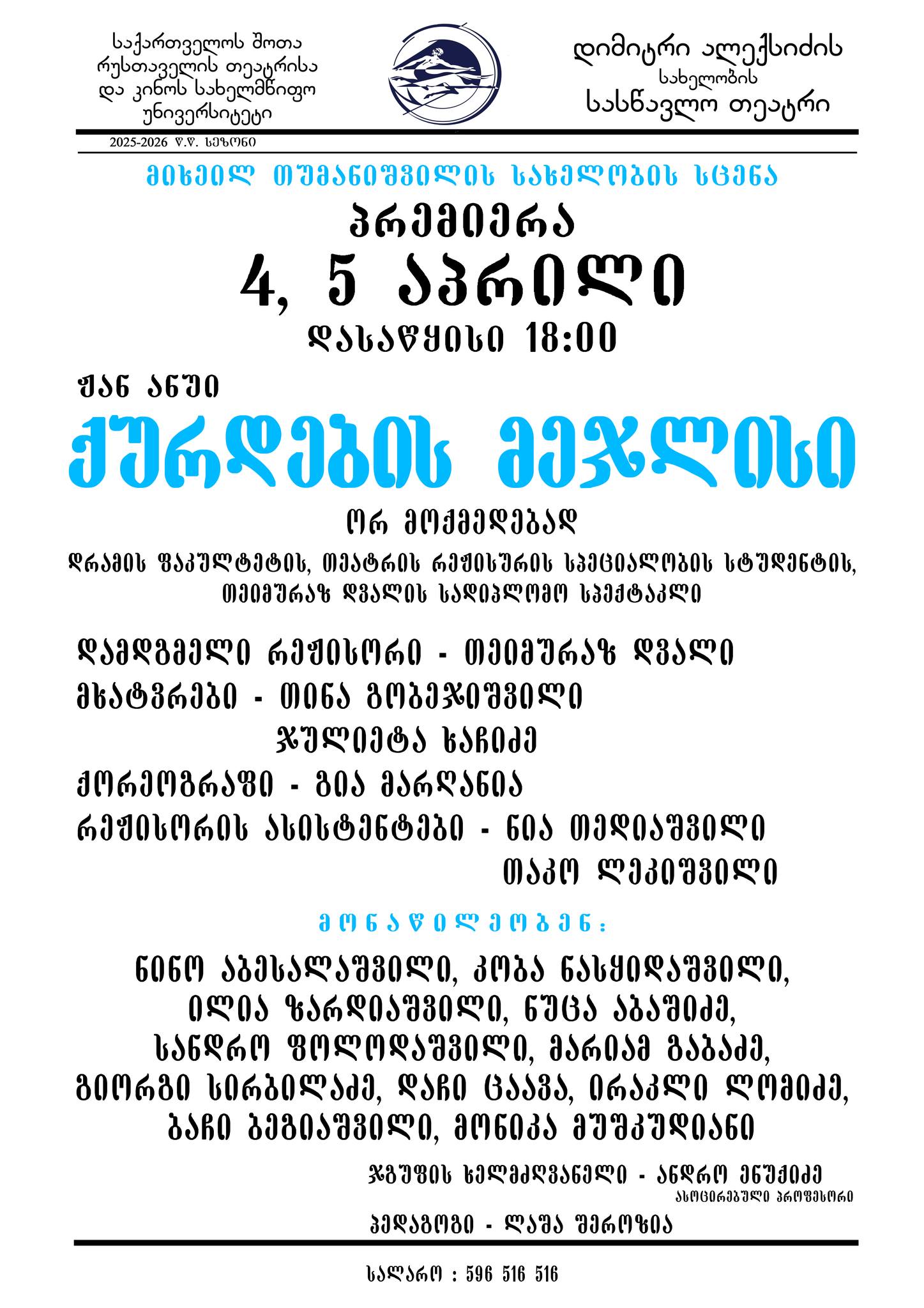 4 და 5 აპრილს, 18:00 საათზე, თეატრისა და კინოს სახელმწიფო უნივერსიტეტის მიხეილ თუმანიშვილის სახელობის სცენაზე პრემიერაა.