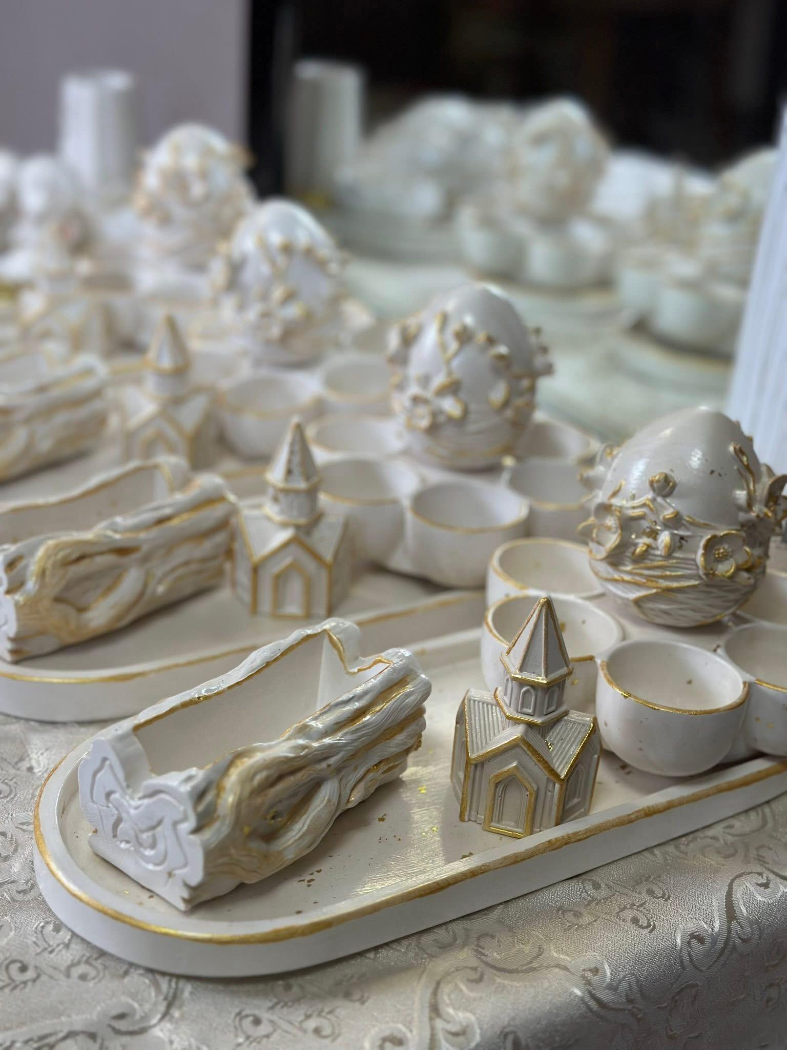 – ვიყენებ სკულპტურულ თაბაშირს, რომელიც იდეალურია დეკორატიული ნაკეთობებისთვის — იძლევა სუფთა, თეთრ და გამძლე ფორმას. დამატებით ვიყენებ ბუნებრივ დეტალებსა და ხარისხიან მასალებს, რათა ნამუშევარი ესთეტიკური და დახვეწილი იყოს.