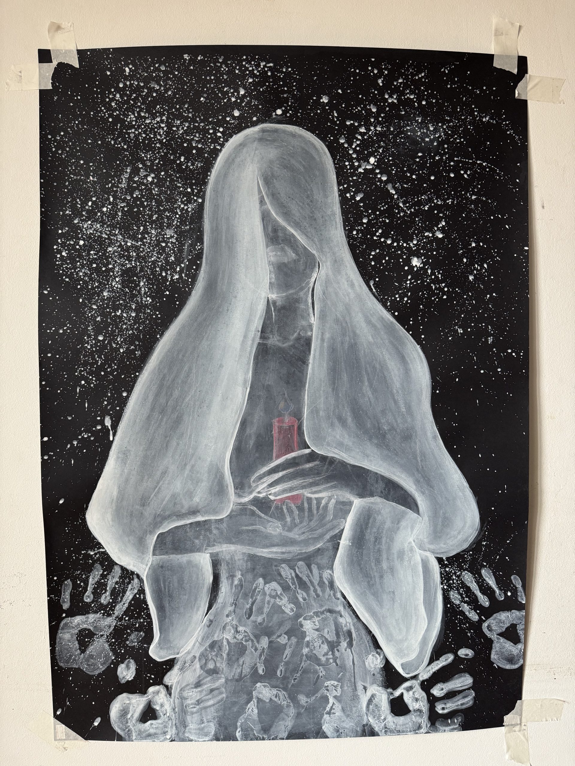 – „სინათლის ძიებაში“ ჩემთვის შინაგანი პროცესის გამოხატვაა. იდეა გაჩნდა იმ პერიოდში, როცა საზოგადოებაში მიმდინარე მოვლენებმა და უსამართლობის განცდამ ჩემზე დიდი გავლენა მოახდინა. თითქოს ადამიანებში შინაგანი სინათლე სანთლით საძებარი გახდა. ნამუშევარი ასახავს ადამიანის მუდმივ ძიებას სინათლის, სიმართლისა და იმ შინაგანი ძალისკენ, რომელიც გვაძლიერებს. მჯერა, რომ თითოეულ ადამიანში არსებობს ეს სინათლე და ჩვენი მიზანია მისი გაღვივება.