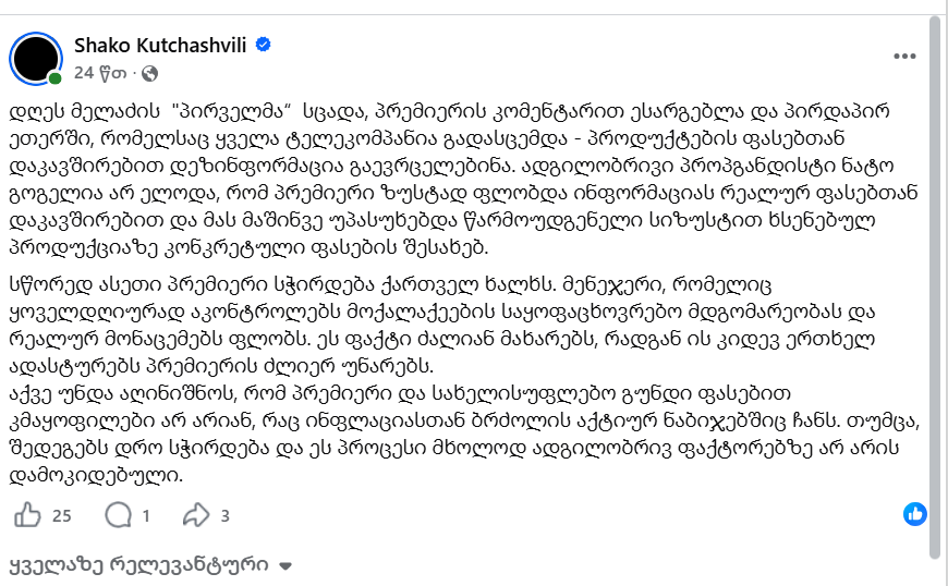დღეს მელაძის “პირველმა“ სცადა, პრემიერის კომენტარით ესარგებლა და პირდაპირ ეთერში, რომელსაც ყველა ტელეკომპანია გადასცემდა – პროდუქტების ფასებთან დაკავშირებით დეზინფორმაცია გაევრცელებინა, – ამის შესახებ სამოქალაქო აქტივისტი, შაკო კუჭაშვილი, სოციალურ ქსელში წერს.