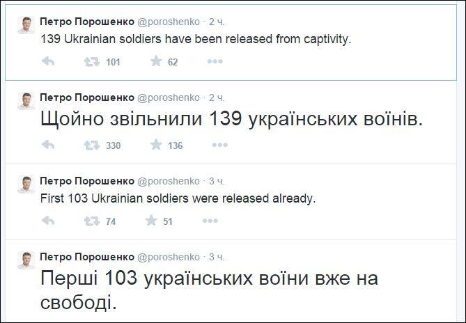 პეტრე პოროშენკომ თავდაპირველად ასევე 103 დატყვევებულის განთავისუფლების შესახებ გააკეთა განცხადება, შემდეგ კი ტყვეობიდან განთავისუფლებულთა განსხვავებული რაოდენობა დაასახელა. უკრაინის პრეზიდენტის ტვიტერზე გაკეთებული განცხადების თანახმად ტყვეობიდან 139 უკრაინელი მებრძოლი განთავისუფლდა.