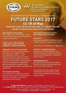 12 – 19 მაისს, იტალიის ქ. პეზაროში კლასიკური მუსიკის მე-6 საერთაშორისო კონკურსი გაიმართება. კონკურსის ორგანიზატორები არიან საქართველოს ხელოვანთა კავშირი „ხელოვანები მომავლისთვის“, კლასიკური მუსიკისა და ხელოვნების საერთაშორისო კომიტეტი „მომავლის ვარსკვლავები” და იტალიის ქ. პეზაროს, რენატა ტებალდის და მარიო დელ მონაკოს სახელობის საერთაშორისო აკადემია „მომავლის ვარსკვლავები“ ( FUTURE STARS 2017).