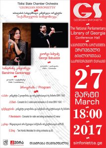 27 მარტს, 18:00 საათზე, საქართველოს პარლამენტის ეროვნული ბიბლიოთეკის საკონფერენციო დარბაზში თბილისის სახელმწიფო კამერული ორკესტრის „საქართველოს სინფონიეტას“ მორიგი კონცერტი გაიმართება. როგორც „კვირას“ ორგანიზატორებმა განუცხადეს, კონცერტში მონაწილეობს არაერთი საერთაშორისო კონკურსის გამარჯვებული, ლუქსემბურგელი მევიოლინე სანდრინე კანტორეჯი და იაპონიაში მოღვაწე ქართველი მევიოლინე და დირიჟორი – გიორგი ბაბუაძე.