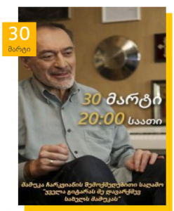 30 მარტს, 20:00 საათზე, თბილისის საკონცერტო დარბაზში, მამუკა ჩარკვიანის შემოქმედებითი საღამო: „ყველა გიტარას მე დავარქმევ სახელს მამუკას“ გაიმართება.