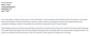 სახელმწიფო დეპარტამენტი აცხადებს, რომ ეს არალეგიტიმური არჩევნები და ე.წ. რეფერენდუმი ტარდება საქართველოს ტერიტორიებზე, საქართველოს მთავრობის თანხმობის გარეშე.