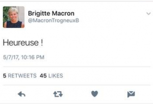საფრანგეთის საპრეზიდენტო არჩევნებში ემანუელ მაკრონის გამარჯვებას მისი ცოლი და მომავალი პირველი ლედი ერთი სიტყვით ეხმაურება. „ბედნიერებაა“, – წერს ბრიჯიტ ტრონიე.