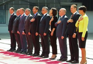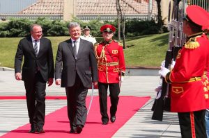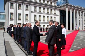 ოფიციალური ცერემონიის ფარგლებში შესრულდა საქართველოსა და უკრაინის სახელმწიფო ჰიმნები, რის შემდეგაც გიორგი მარგველაშვილმა და პეტრო პოროშენკომ საქართველოს სახელმწიფო დროშას მიაგეს პატივი და ერთმანეთს სახელმწიფო დელეგაციები წარუდგინეს.