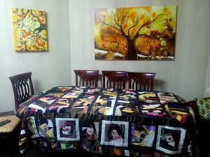 ამ ახალ გადასაფარებელს, რომელიც ქვილთის ტექნიკით ქართული ფერებით გავაკეთე, ონის მხარეთმცოდნეობის ახალი მუზეუმს გადავცემ, ასე რომ, ონს ვჩუქნი…