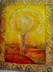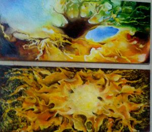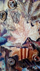 სურათი „შემოდგომა“ ექსპერიმენტია და სხვადასხვა მასალით დიდხანს ვხატავდი… აქ ნამდვილი ფოთლის ანაბეჭდებია ამოყვანილი. მეორე ნამუშევარი „სიცოცხლის ხე“ კი უცებ დავხატე.