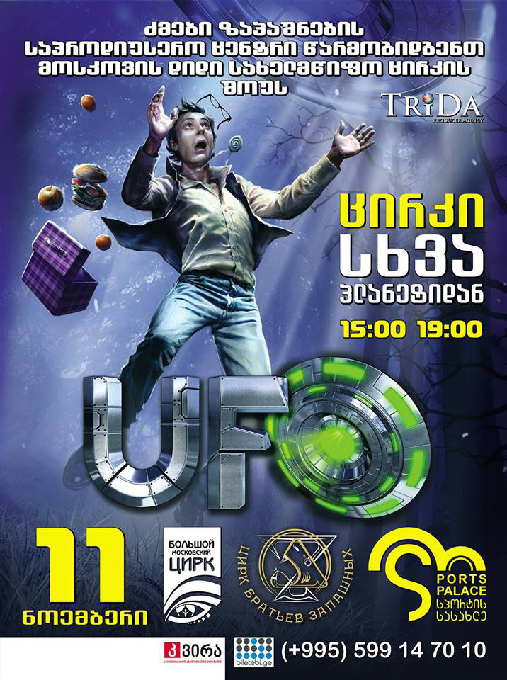 გალაქტიკური პეიზაჟები , კოსმოსური ფრენები და არაამქვეყნიური სილამაზე – ტურნეს ფარგლებში მოსკოვის სახელმწიფო ცირკი, ძმები „ზაპაშნები“ მსოფლიოში აღიარებული პროგრამით „UFO” უკვე ბაქოს ეწვია. დასი – 90 არტისტის შემადგენლობით 4 ნოემბრის წარმოდგენისთვის ემზადება , რის შემდეგაც ისინი საქართველოსკენ აიღებენ გეზს. 7 ნოემბრიდან თბილისს ეწვევიან და სპორტის სასახლეში მსოფლიოში ყველაზე ნიჭიერი მსახიობებით და ჟონგლიორებით დაკომპლექტებული პროექტი „UFO” – 11 ნოემბრისთვის დაგეგმილი ჩვენებისთვის დაიწყებს მზადებას.