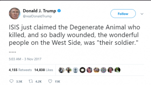 ტრამპმა „ისლამური სახელმწიფოს“ დღევანდელ განცხადებაზე კომენტარი გააკეთა და შესაბამისი პოსტი გამოაქვეყნა: „ ISIS-მა აღიარა, რომ „დეგენერატი ცხოველი“, რომელმაც მოკლა და დაჭრა არაჩვეულებრივი ადამიანები ვესთ საიდში, მათი ჯარისკაცია“.
