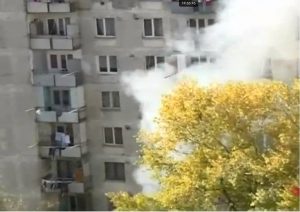 46-ე კორპუსში ჩამონგრეულია რამდენიმე სახლის ფასადი, ჩამსხვრეულია შუშები და კორპუსიდან ამოდის კვამლი.