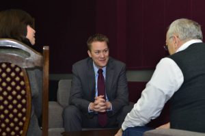 აშშ-ს საელჩოს იურიდიულ საკითხთა მრჩეველმა თავის მხრივ შეხედულება საუნივერსიტეტო დიპლომატიასთან დაკავშირებით გაიზიარა და აღნიშნა,რომ უნივერსიტეტის შესახებ ბევრი რამ სმენია. მისი თქმით ძალიან მნიშვნელოვანია სსუ-სთან ურთიერთობა და ეს ურთიერთობა სურს სხვა ხარისხში აიყვანოს. უნივერსიტეტში შეხვედრის მეორე ნაწილი საჯარო ლექციის სახით თემაზე “ეთიკა იურისტებისათვის” იურიდიული ფაკულტეტის სტუდენტებს დაეთმო. პრეზენტაცია სსუ-ს რექტორმა,პროფესორმა ზურაბ ხონელიძემ გახსნა. მან სტუდენტებს ბ-ნი გრანტი წარუდგინა და ჯანსაღი სახელმწიფოს მშენებლობაზე , მის უმთავრეს ფუნდამენტზე -უნივერსიტეტზე ისაუბრა. რექტორმა წარმატებები უსურვა ბ-ნ გრანტს და აღნიშნა,რომ ეს შეხვედრა ორივე მხარისათვის სასარგებლო ,შეუქცევადი და შედეგზე ორიენტირებული იქნება. პრეზენტაციის ფარგლებში სსუ-ს იურიდიული ფაკულტეტის სტუდენტებს ბ-ნმა მაიკლმა ეთიკის არსი, დანიშნულება სხვადასხვა კაზუსის საშუალებით აუხსნა. ეკრანზე გამოსახული სიტუაციური ამოცანები სტუდენტებს უნდა ამოეხსნათ. სპეციალური ე.წ „კლიკერებით“ისინი ნიშნავდნენ თავიანთ პასუხებს და ეკრანზე ბ-ნ გრანტს დიაგრამის საშუალებით მოსაზრებებს უზიარებდნენ. ბ-ნმა გრანტმა სტუდენტები აშშ-სა და საქართველოს გულსაბნევებით დააჯილდოვა, ყურადღება გაამახვილა ეთიკის კოდექსზე , ასევე ე.წ. „smell test“-ზე . ისაუბრა, თუ რა ქმნის ეთიკას , ხაზი გაუსვა საქართველოს მაგალითებს ეთიკის კოდექსსა და მის არსებობას. ადამიანის უფლებების დაცვა ,მოქალაქეთა დამოუკიდებლობა და დისკრიმინაცია კაზუსების მთავარი თემა იყო.