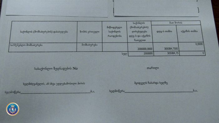 საქართველოს ფინანსთა სამინისტროს საგამოძიებო სამსახურის თანამშრომლებმა, გატარებული ოპერატიულ – სამძებრო ღონისძიებებისა და საგამოძიებო მოქმედებების შედეგად, ყალბი საგადასახადო დოკუმენტის დამზადება – გასაღების ფაქტზე ერთ – ერთი კომპანიის დირექტორი დააკავეს.