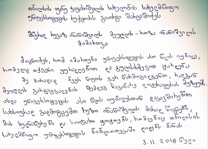 „მსურს დიდი მადლობა გადავუხადო რევაზ ინანიშვილის მეუღლეს, როზა ინანიშვილს, რომელმაც თბილისის სახელმწიფო უნივერსიტეტს იუბილეზე საჩუქრად მწერლის პირადი წიგნები, ხელნაწერები და ფოტოები გადასცა.