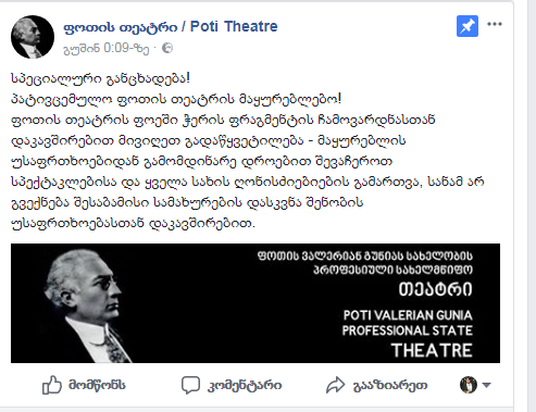 ფოთის ვალერიან გუნიას სახელობის პროფესიულ თეატრში სპექტაკლები შეჩერდა. მიზეზს თავად თეატრის მესვეურნი განმარტავნ სპეციალურ განცხადებაში, რომელსაც „კვირა“ უცვლელად გთავაზობთ: