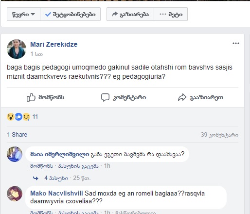 „ბაგა-ბაღის პედაგოგი უმოქმედო, გაყინულ საძინებელ ოთახში რომ ბავშვს დასჯის მიზნით დაამწყვდევს, რა ეკუთვნის? ეს პედაგოგის მეთოდია?!“,- ეს მიმართვა 5 წლის ანდრია რ.-ს ბებიამ მარიამ ზერეკიძემ სოციალურ ქსელში დღეს დილით განათავსა.