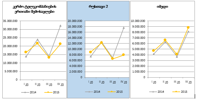 ზემოთ მოყვანილი ცხრილებიდან ჩანს, რომ 2015 წლის მეოთხე კვარტლის სარეკლამო შემოსავლებში „ტელეიმედის“ მონაცემებში კლება არ შეინიშნება. ხოლო ტელეკომპანია „რუსთავი 2“- ის 2015 წლის მეოთხე კვარტლის შემოსავალი 2014 წლის ანალოგიურ მაჩვენებელთან შედარებით შემცირებულია 55%–ით, მაშინ როდესაც პირველი სამი კვარტალი გაზრდილია 3%–ით. თუ გავითვალისწინებთ იმ გარემოებას, რომ „რუსთავი 2“-ის სამი კვარტლის მონაცემებსა და სხვა სატელევიზიო არხების შემოსავლების ტრენდის დინამიკაში ცვლილება არ მომხდარა, 2015 წლის მეოთხე კვარტალში კომპანია რუსთავი 2–ს სულ მცირე 10 მილიონი ლარით მეტი შემოსავალი უნდა მიეღო.