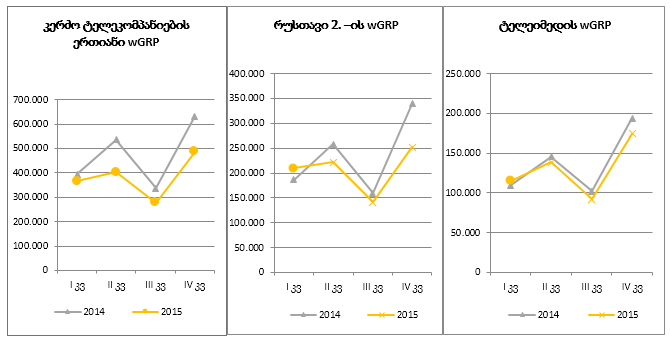 ამ დასკვნას ამყარებს ის ფაქტიც, რომ მეოთხე კვარტალში შემოსავლების კლება არ არის გაყიდული რეკლამის შეწონილი სარეიტინგო პუნქტების ე.წ. „wGRP”–ის დინამიკის პროპორციული. თუ გაყიდული რეკლამის მოცულობის დინამიკას შევადარებთ მის სანაცვლოდ მიღებულ შემოსავალს დავინახავთ, რომ გაყიდულ სარეკლამო მომსახურებას კვარტლების მიხედვით ახასიათებს ციკლურობა და მეოთხე კვარტალში შემოსავლები, ისევე, როგორც გაყიდული „wGRP” იზრდება, რაც არ მოხდა 2015 წლის მეოთხე კვარტალში მხოლოდ რუსთავი 2-ის შემთხვევაში. გაყიდული რეკლამის სტაბილური ტენდენცია მხოლოდ რუსთავი 2-ის 2015 წლის მე–4 კვარტლის შემოსავლებზე არ აისახა.