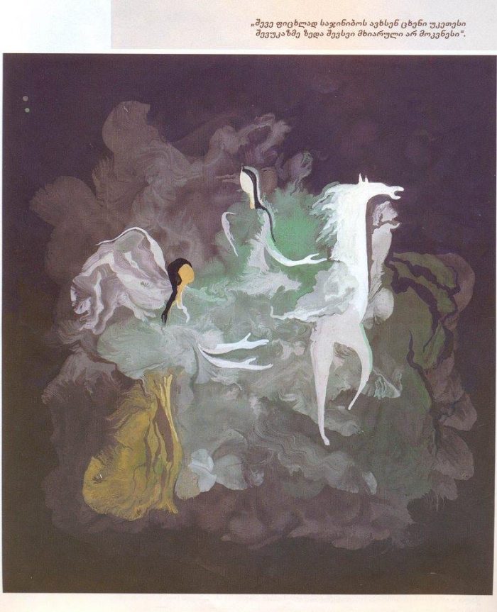 „ჩემი შექმნილი ილუსტრაციები გამოფენაზე გავიტანე. „საბჭოთა ხელოვნების“ რედაქტორს, ოთარ ეგაძეს მოეწონა ნამუშევრები და “საბჭოთა ხელოვნებაში” დაბეჭდა. მუშაობა განვაგრძე. მაშინ ჯანმრთელი მხედველობა მქონდა და შედარებით ახალგაზრდაც ვიყავი. დაახლოებით 80 ილუსტრაცია შევქმენი. ცხადია, ყველა ერთი დონის არ არის. მათ შორის, შეიძლება, კაცმა 50 ამოარჩიოს, რომელიც ღირსეულია“.