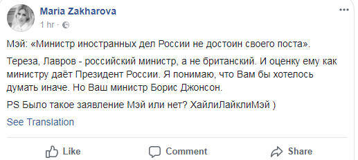 რუსეთის საგარეო საქმეთა სამინისტროს ოფიციალურმა წარმომადგენელი, მარია ზახაროვა სოციალურ ქსელში დიდი ბრიტანეთის პრემიერ-მინისტრის, ტერეზა მეის პარლამენტში სიტყვით გამოსვლას გამოეხმაურა, რომელმაც რუსეთის საგარეო საქმეთა მინისტრს, სერგეი ლავროვს თანამდებობისთვის შეუფერებელი უწოდა.
