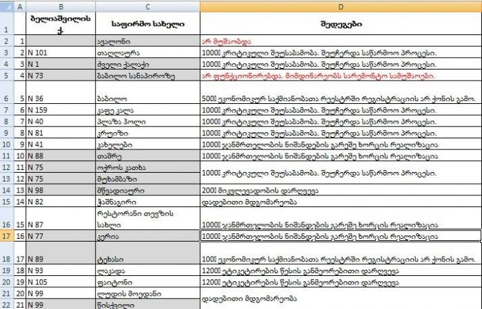 სხვადასხვა დარღვევის, მათ შორის, ჯანმრთელობის ნიშანდების გარეშე ხორცის რეალიზაციის, ეტიკეტირების წესისა და მიკვლევადობის დარღვევის, ეკონომიკურ საქმიანობათა რეესტრში რეგისტრაციის არქონის გამო დაჯარიმდა 9 ბიზნესოპერატორი, დადებითი მდგომარეობა დაფიქსირდა 3 რესტორანში.