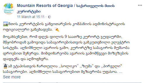 კიდევ ერთხელ, ბოდიშს გიხდით შექმნილი მდგომარეობის გამო“, -აღნიშნულია განცხადებაში, რომელიც მთის კურორტების განვითარების კომპანიის ადმინისტრაციამ 11 მარტს გაავრცელა.